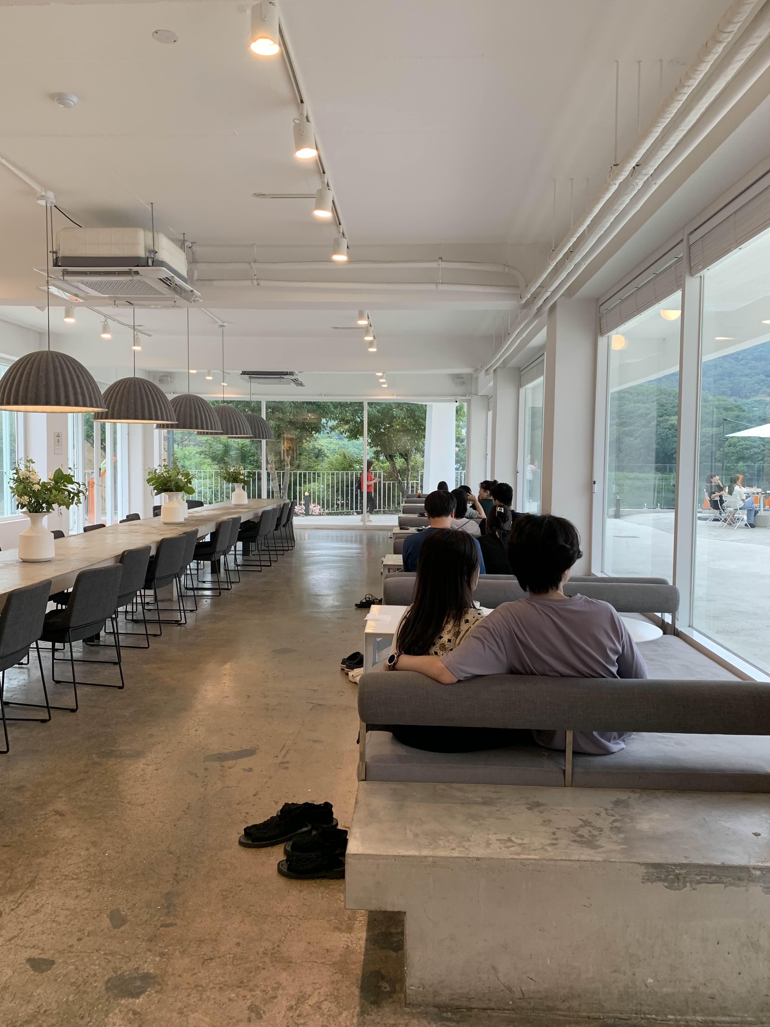 계단을 내려가서 지하느낌이 나지만 여기 또한 통창과 기산저수지가 잘 보이는 구조로 지하의 느낌은 하나도 안 났다.