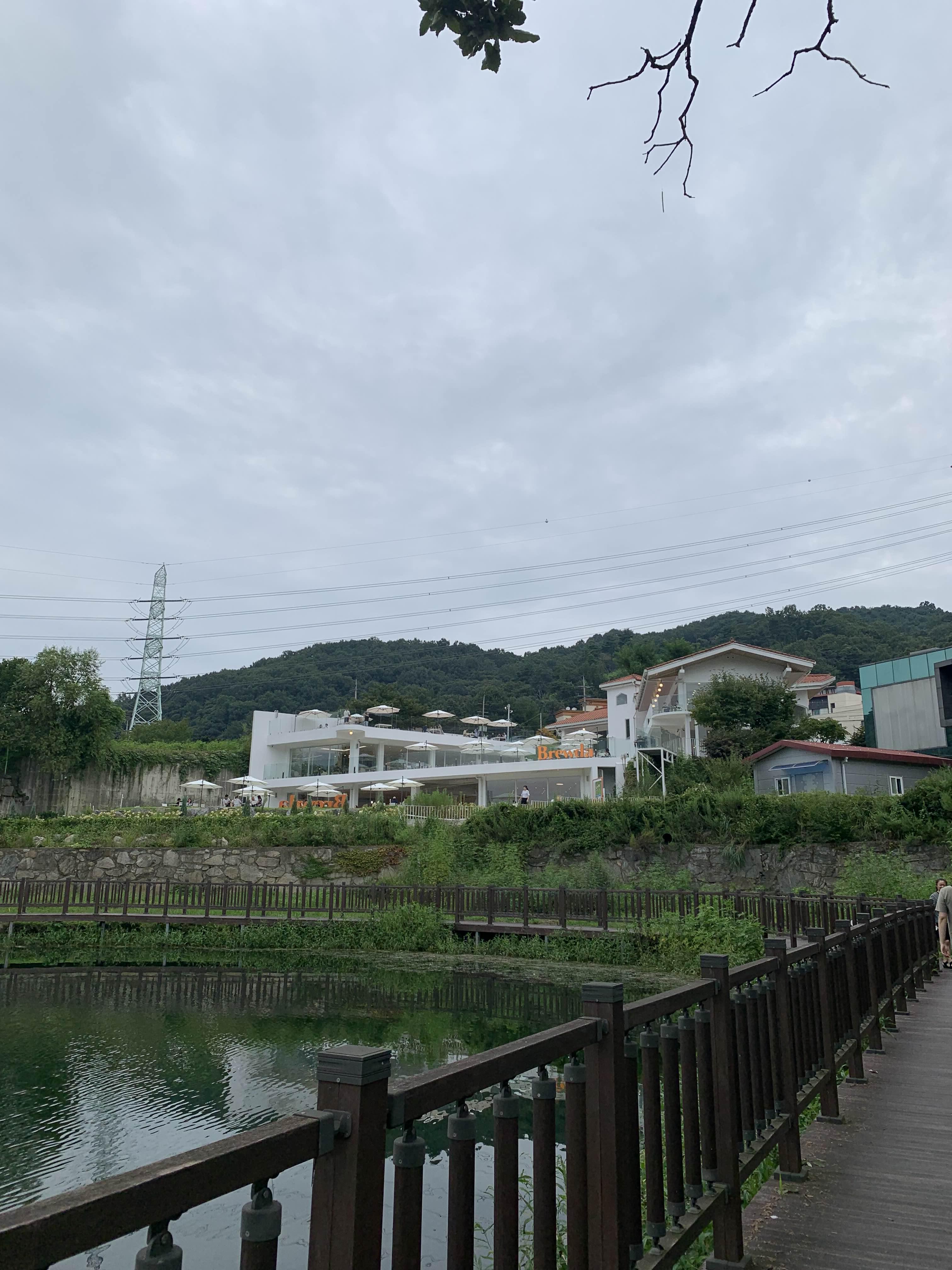 저수지 전체를 다 돌지는 못했지만, 물 위에 다리가 있어서 물고기도 보고 숲냄새를 만끽하며 카페의 전경을 보니