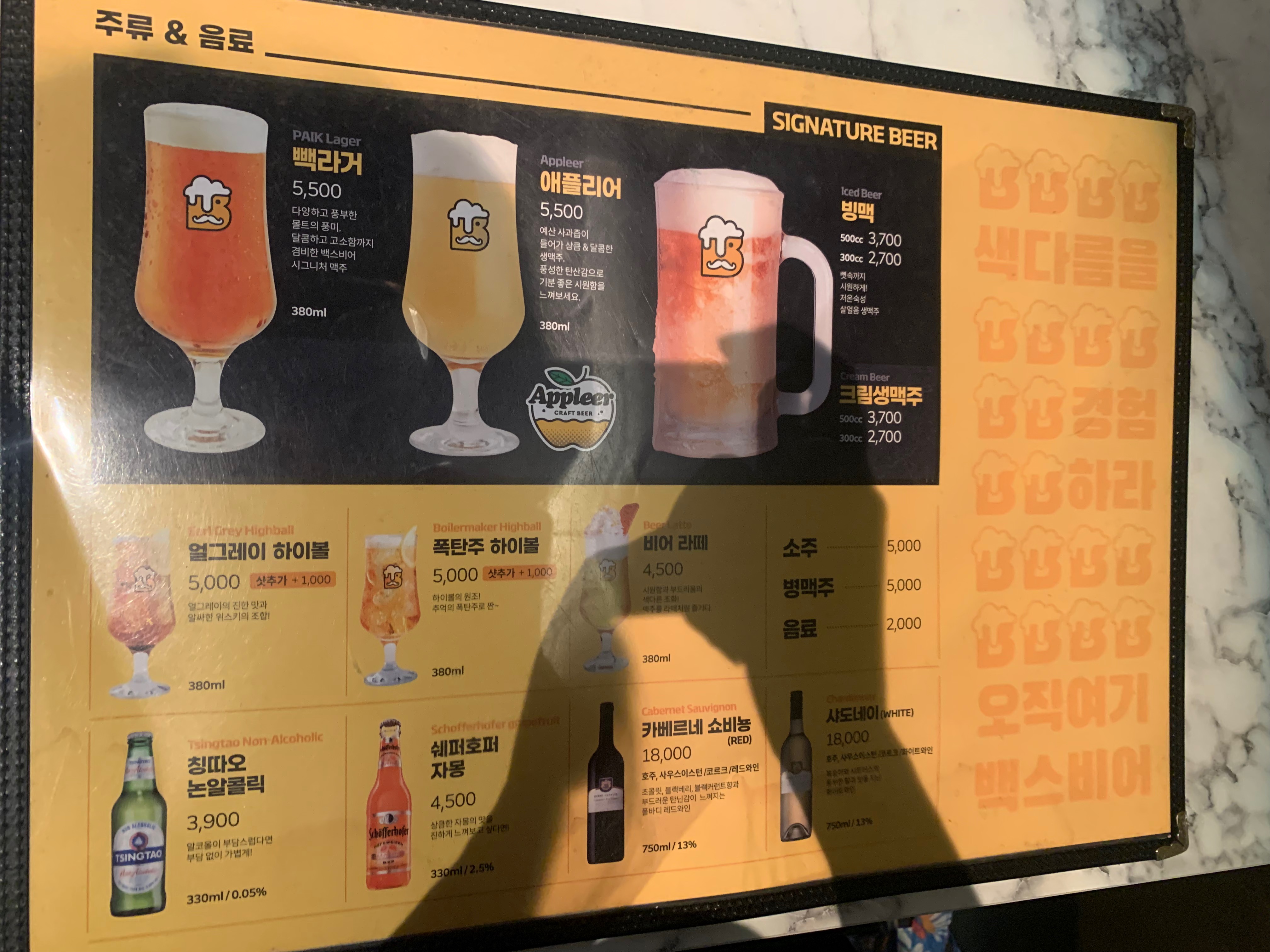 맥주 말고도 하이볼, 예산 사과로 만든 애플리어, 비어라떼 같은 메뉴로 술을 안좋아하는 분들도 즐길 수 있는 곳이었다.