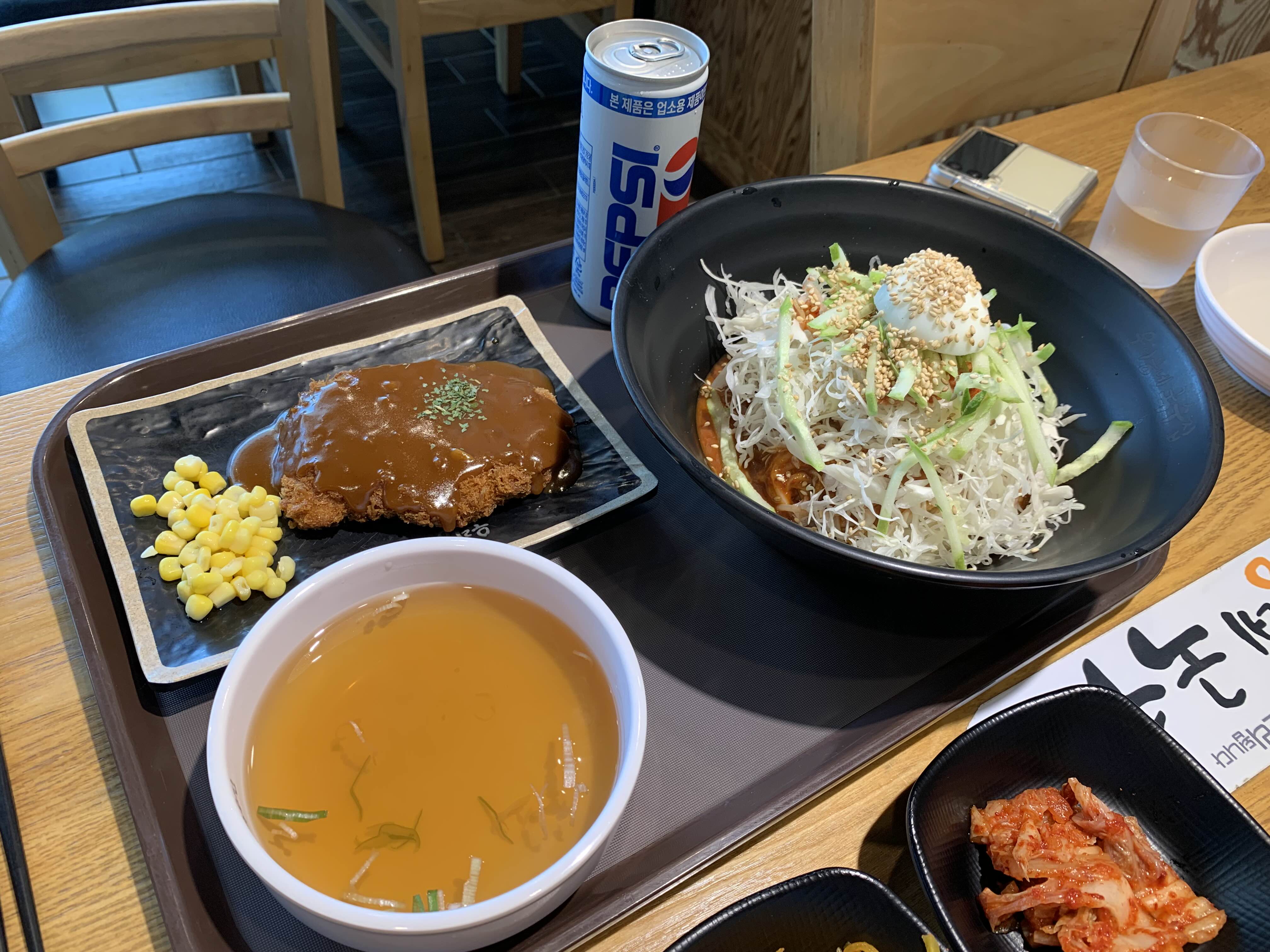 오빠는 비빔국수 + 돈가스 세트를 시켰다.