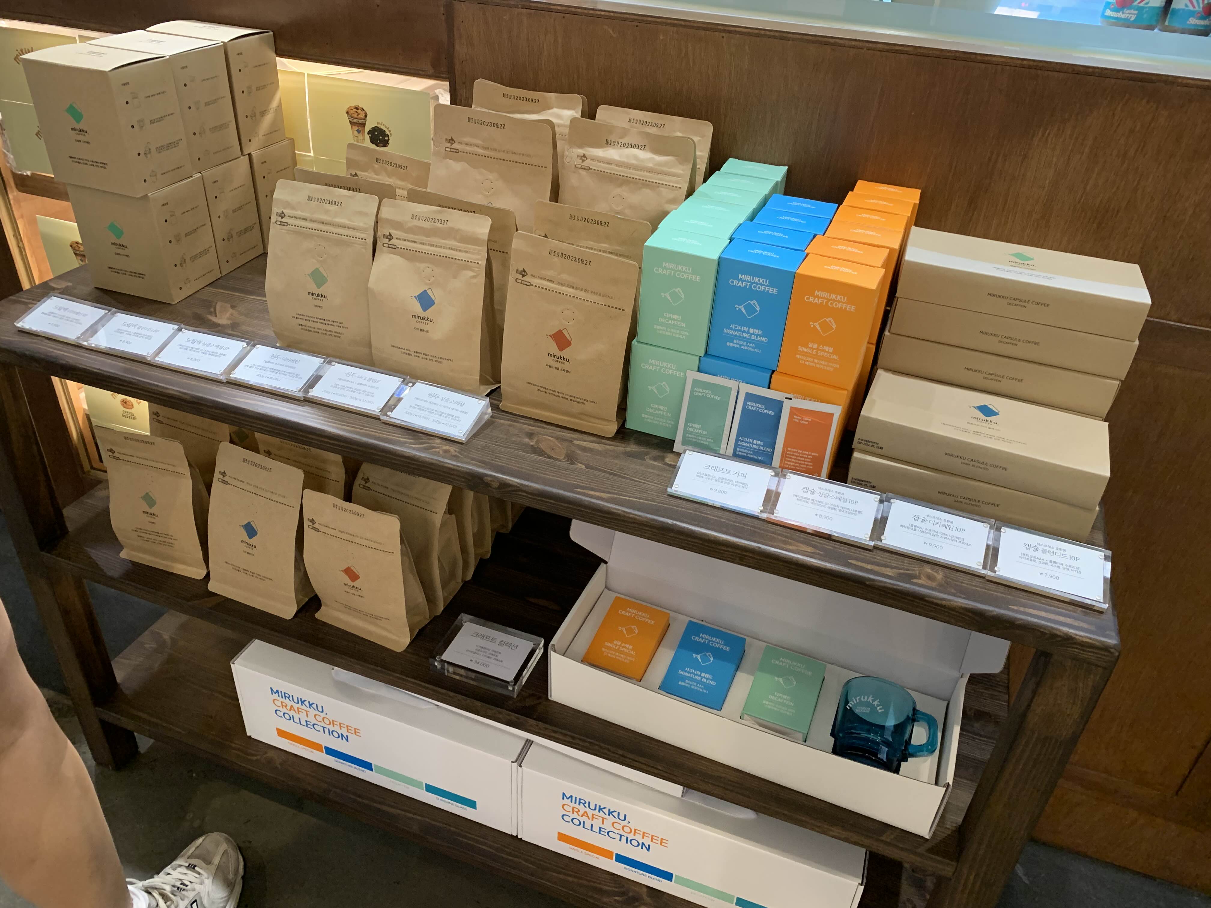 커피외에도 쿠키, 바스크츠즈케이크, 밀크티, 티, MD상품들이 다양하게 진열되어있다.
