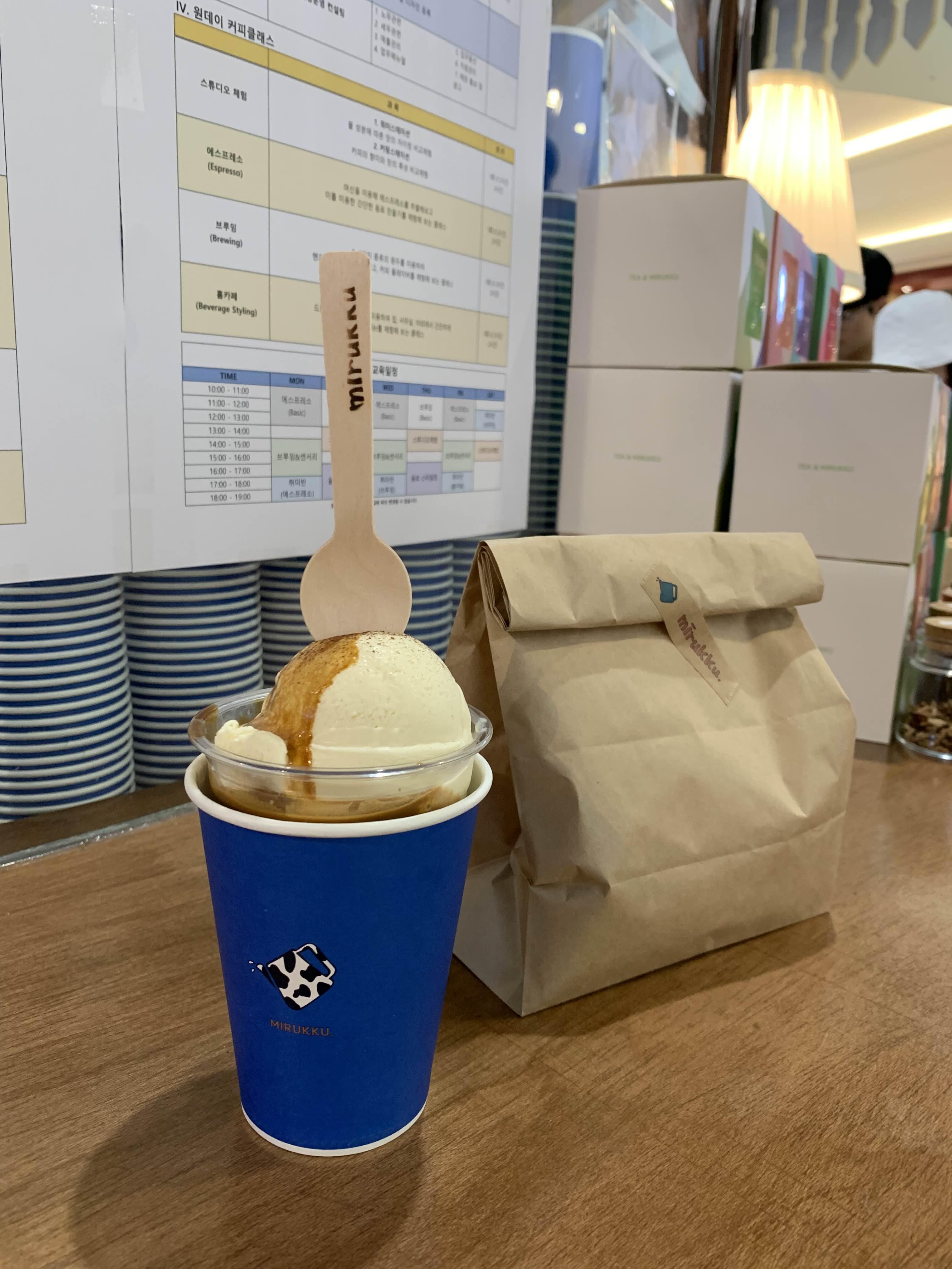 잔에 얼음 가득 에스프레소 그리고 바닐라 아이스크림이 한스쿱이 올려져있었다.